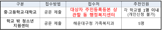 1. 지원대상 : 해운대구에 1년 이상 주민등록이 되어 있는 중·고·대학생 및 학교 밖 청소년