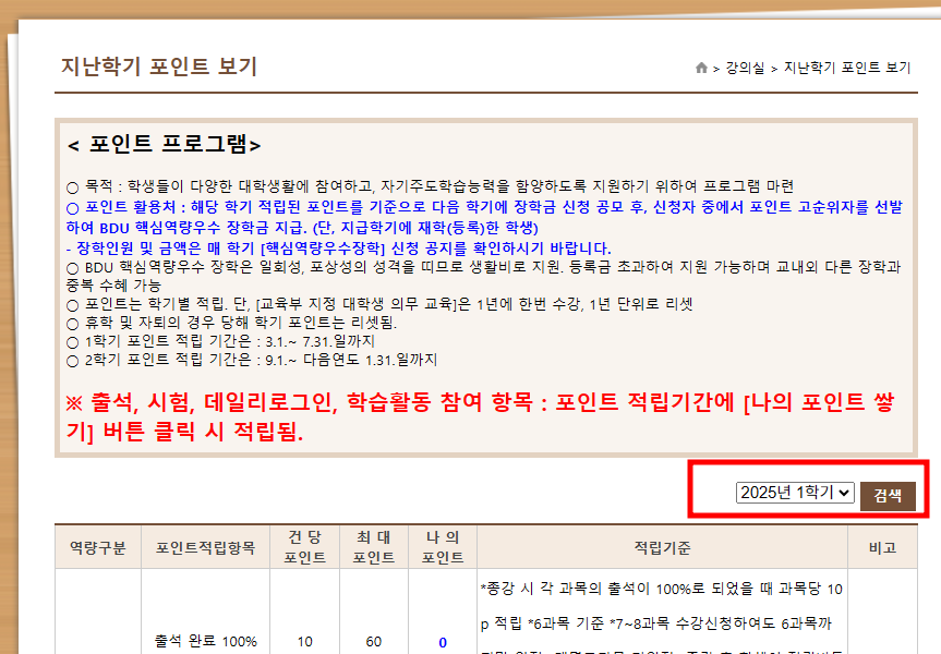 로그인 - [마이페이지]-[지난학기 포인트 보기] - 2025년 1학기 검색 클릭