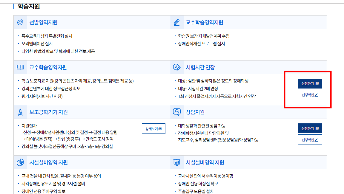 5. 신청방법 : 장애학생지원센터 홈페이지 - [학습지원] - 시험시간 연장 신청하기 버튼 클릭! (학교 로그인 X)