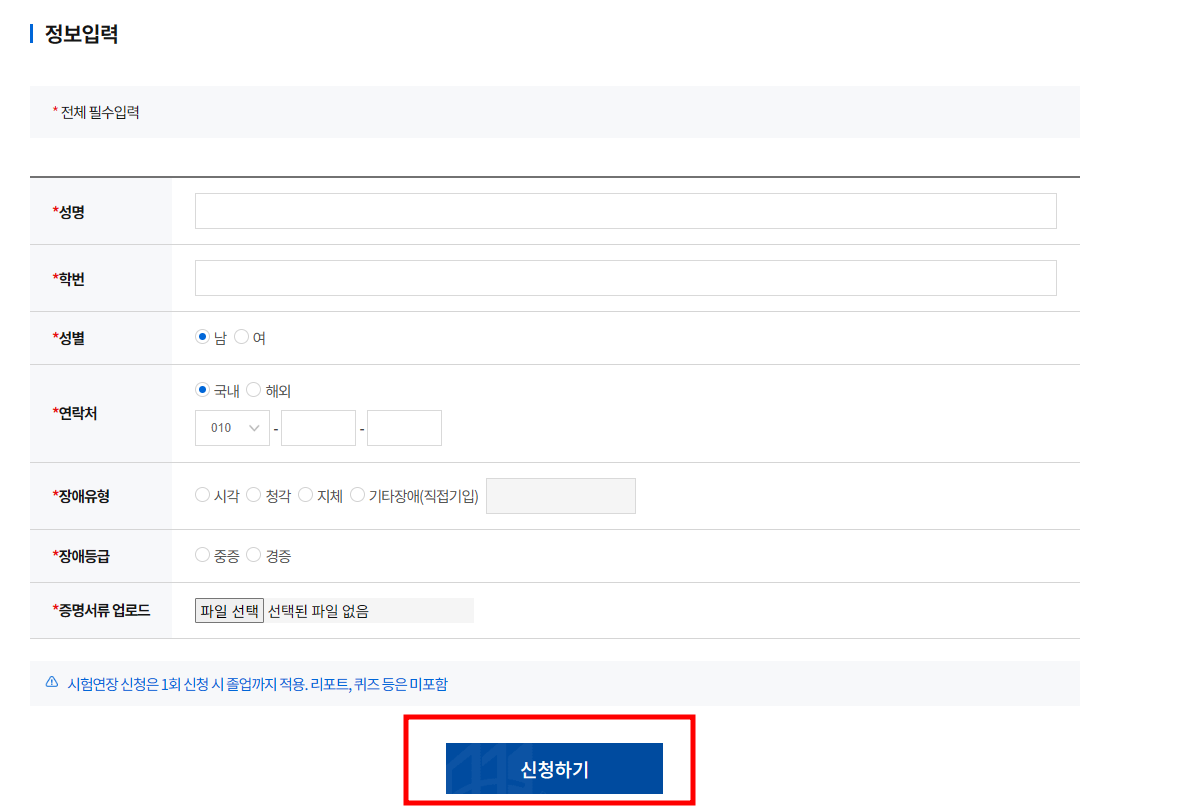* 매학기 신청의 불편함을 해결하고자 기존에 단 한번이라도 장애학생 시험시간 연장을 받은 학생은 별도의 신청없이 자동으로 시험시간이 연장됩니다.