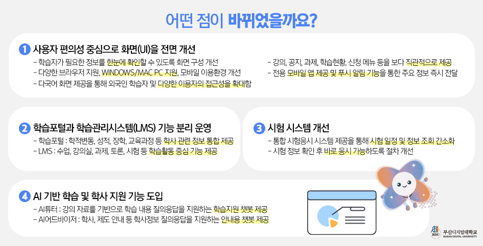 가. 사용자 편의성 중심으로 화면(UI)을 전면 개선 - 학습자가 필요한 정보를 한눈에 확인할 수 있도록 화면 구성 개선 - 강의, 공지, 과제, 학습현황, 신청 메뉴 등을 보다 직관적으로 제공 - 다양한 브라우저 지원, Windows/Mac PC 지원, 모바일 이용환경 개선 - 전용 모바일 앱 제공 및 푸시 알림 기능을 통한 주요 정보 즉시 전달 - 다국어 화면 제공을 통해 외국인 학습자 및 다양한 이용자의 접근성을 확대함 나. 학습포털과 학습관리시스템(LMS) 기능 분리 운영 - 학습포털 : 학적변동, 성적, 장학, 교육과정 등 학사 관련 정보 통합 제공 - LMS : 수업, 강의실, 과제, 토론, 시험 등 학습활동 중심 기능 제공 다. 시험 시스템 개선 - 통합 시험응시 시스템 제공을 통해 시험 일정 및 정보 조회 간소화 - 시험 정보 확인 후 바로 응시 가능하도록 절차 개선 라. AI 기반 학습 및 학사 지원 기능 도입 - AI튜터 : 강의 자료를 기반으로 학습 내용 질의응답을 지원하는 학습지원 챗봇 제공 - AI어드바이저 : 학사, 제도 안내 등 학사정보 질의응답을 지원하는 안내용 챗봇 제공 |