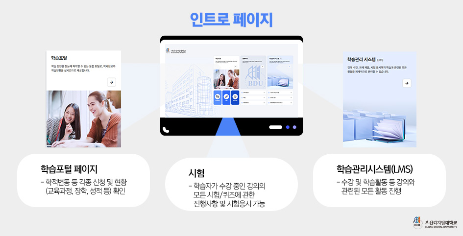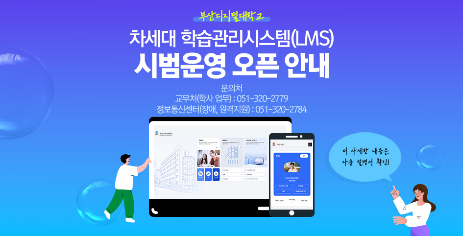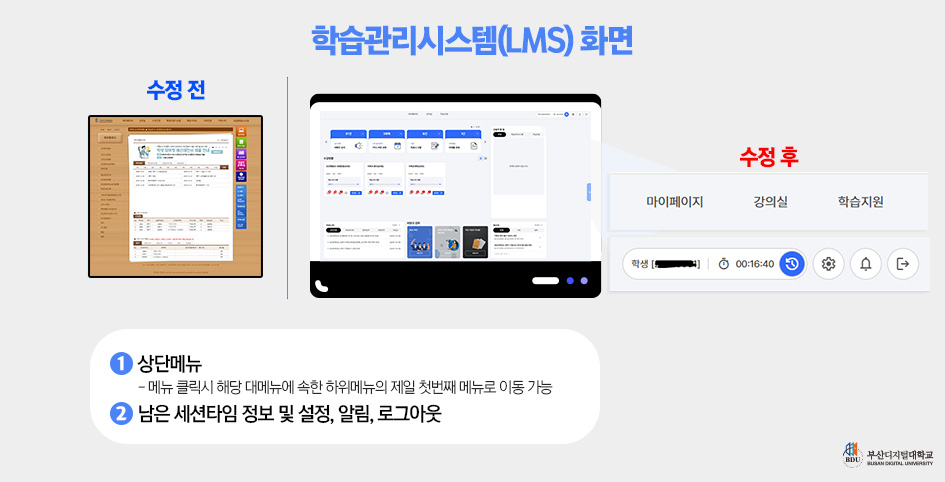 부산디지털대학교에서는 온라인 수업 운영의 고도화 및 원활한 학사운영을 위하여 차세대 학습관리시스템(LMS)을 새롭게 구축하였습니다.