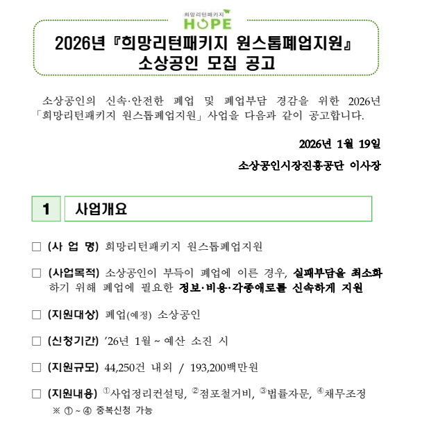 2026년『희망리턴패키지 원스톱폐업지원』 소상공인 모집 공고