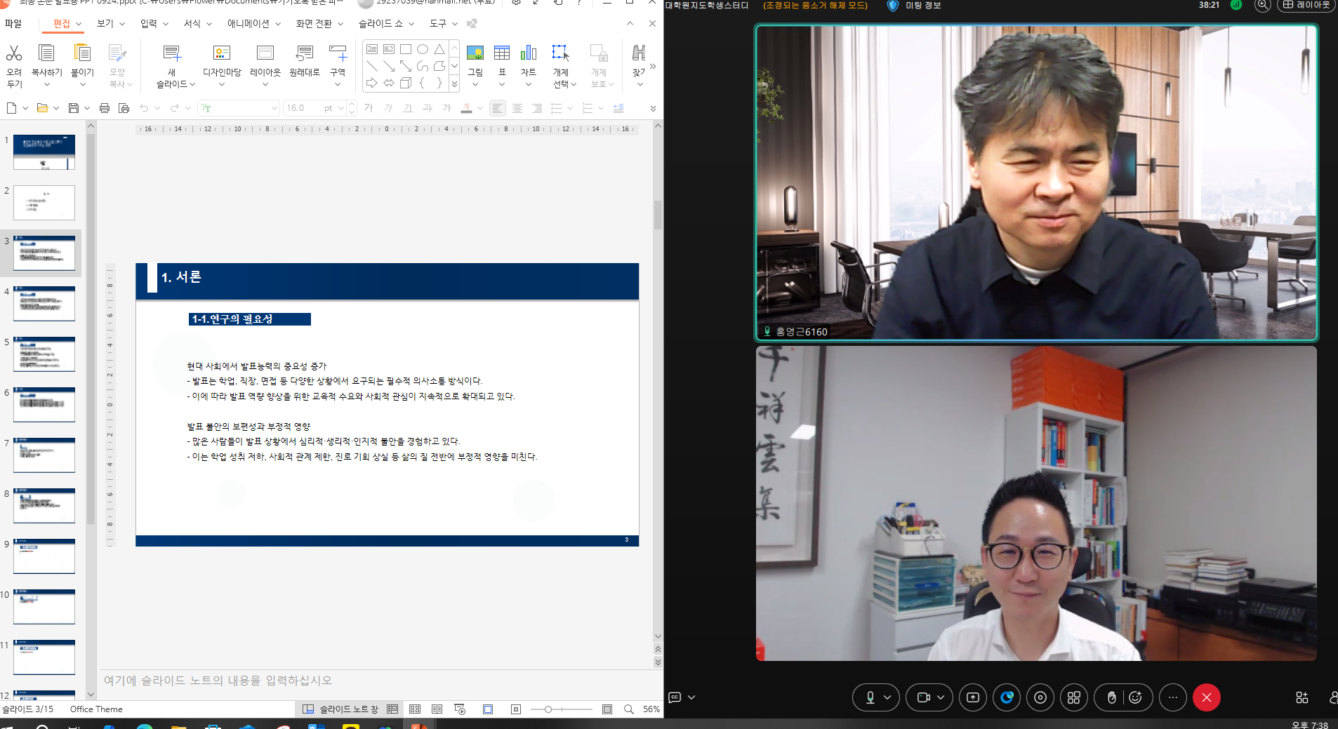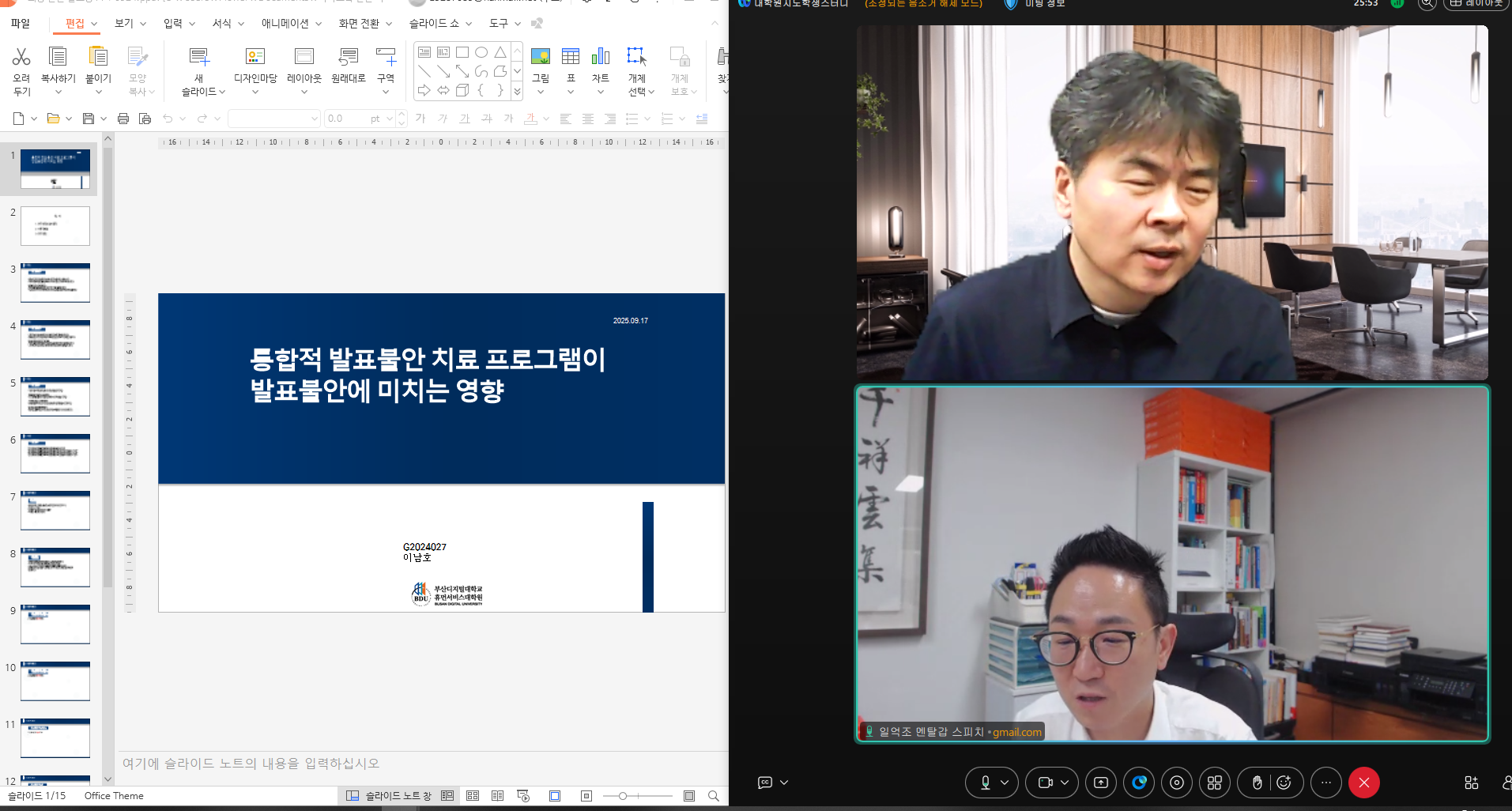 9월 24일 대학원지도학생 스터디 있었습니다. 학위 논문 준비를 위한 연구주제 발표 및 피드백이 있었습니다. 주제는 1가지로 [통합적 발표불안 치료 프로그램이 발표불안에 미치는 영향]이었습니다. 수고 많으셨습니다. 다음 시간(9월 30일)에 뵙겠습니다.