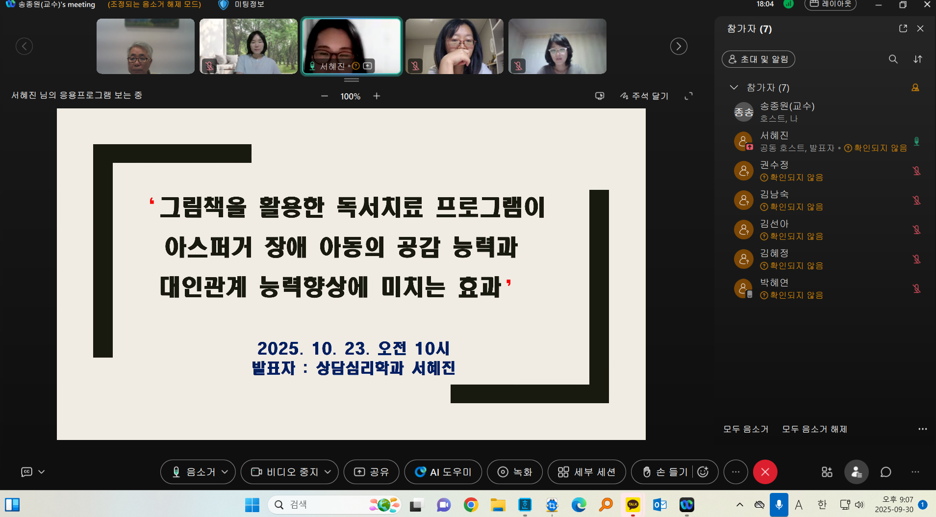9월 30일(화) 19시에 ‘상담심리학과 송종원교수 지도학생 스터디’를 실시하였다.