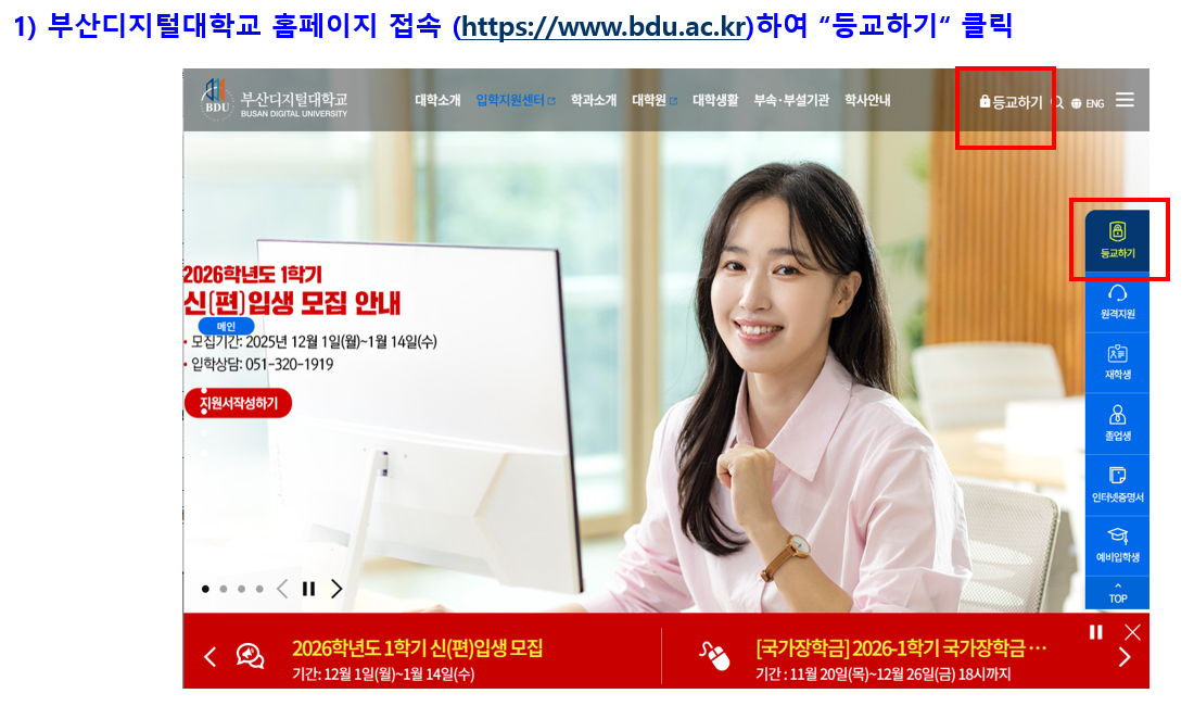 . 접속 경로 : 대학 메인 홈페이지 [등교하기] 메뉴 선택(기존과 동일)