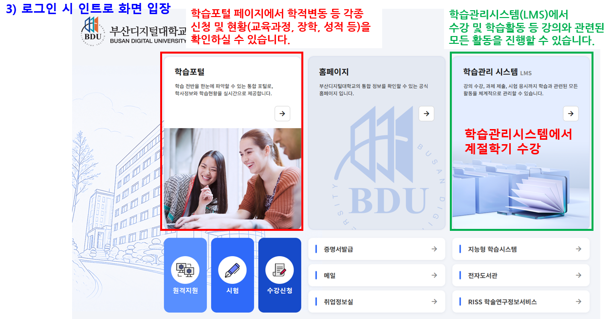 - 학습포털 : 학적변동, 성적, 장학, 교육과정 등 학사 관련 정보 통합 제공