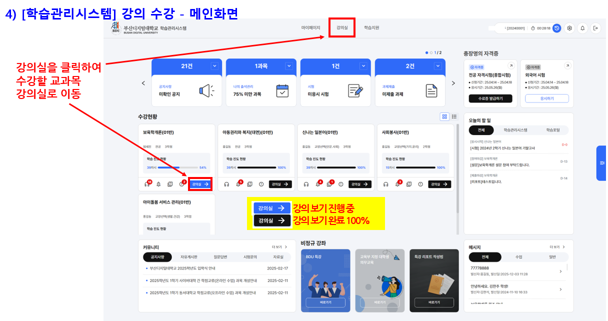 - 강의, 공지, 과제, 학습현황, 신청 메뉴 등을 보다 직관적으로 제공