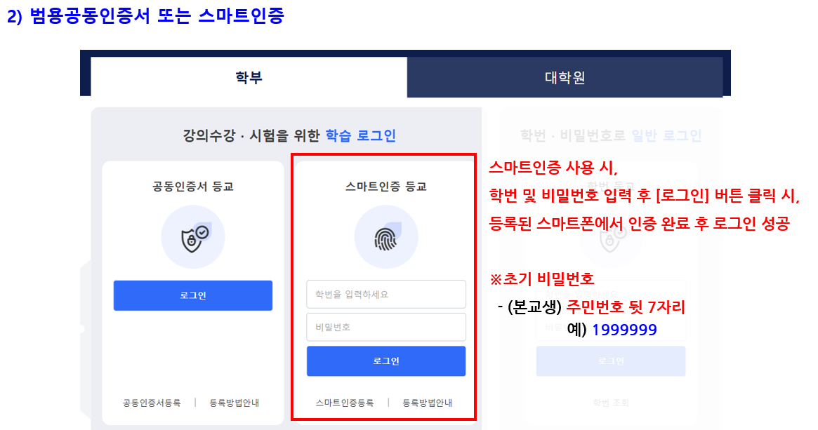 스마트인증 로그인 시, 비밀번호 입력 (초기 비밀번호 : [본교생] 주민등록번호 뒷 7자리)