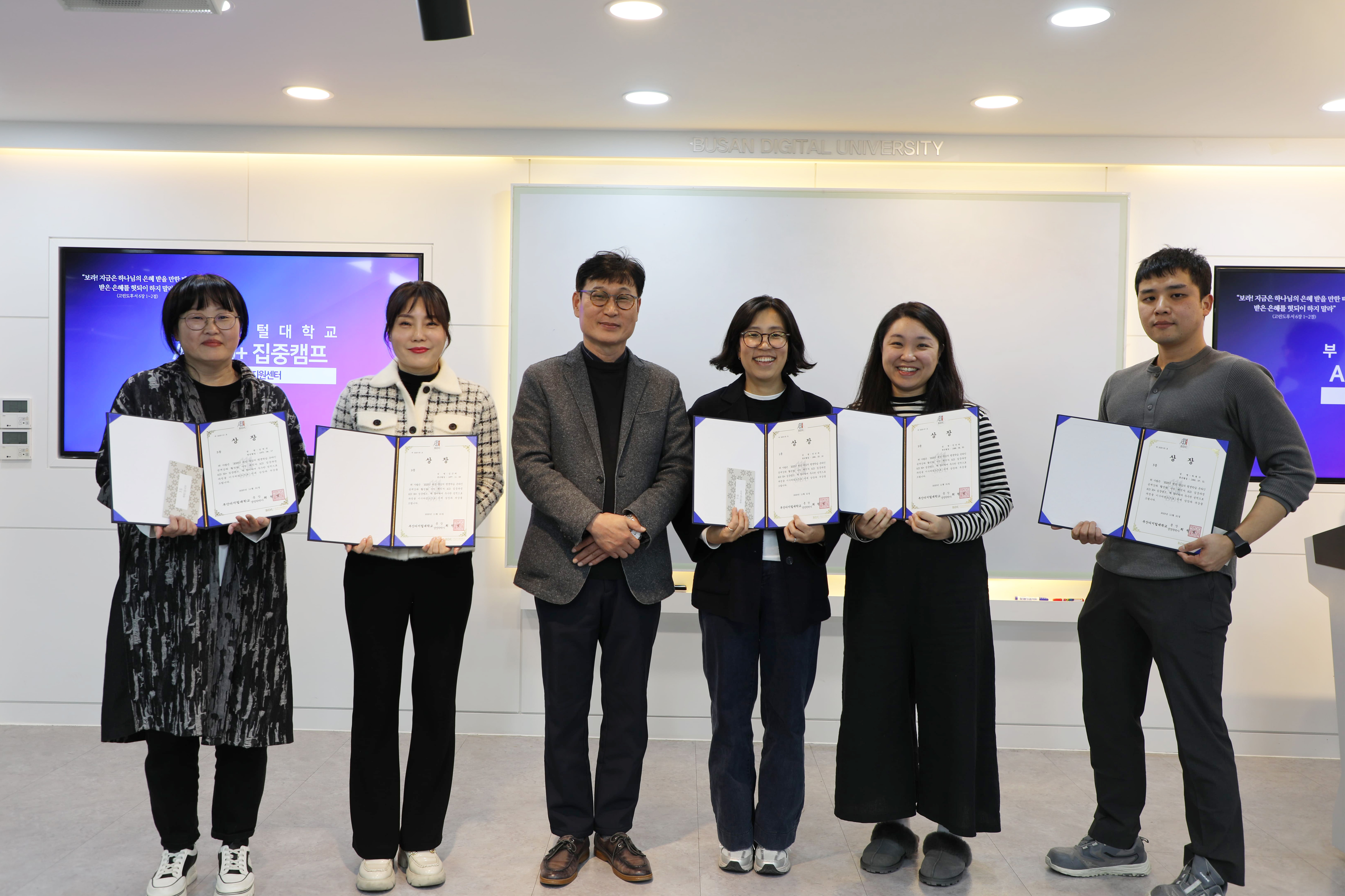 부산디지털대학교 AID사업단은 11월 21일(금) 본교 화상강의실에서 교육부와 국가평생교육진흥원이 주관하는 ‘재직자 AI·디지털(AID) 집중과정 – AID 30+ 집중캠프’ 2기 과정을 성공적으로 마무리하고 수료생을 배출했다고 밝혔다.