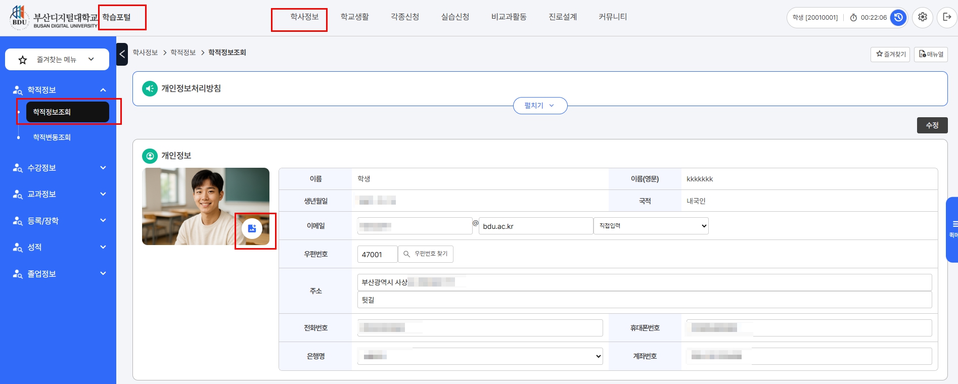 → 학사정보 → 학적정보 → 학적정보조회 → 사진등록