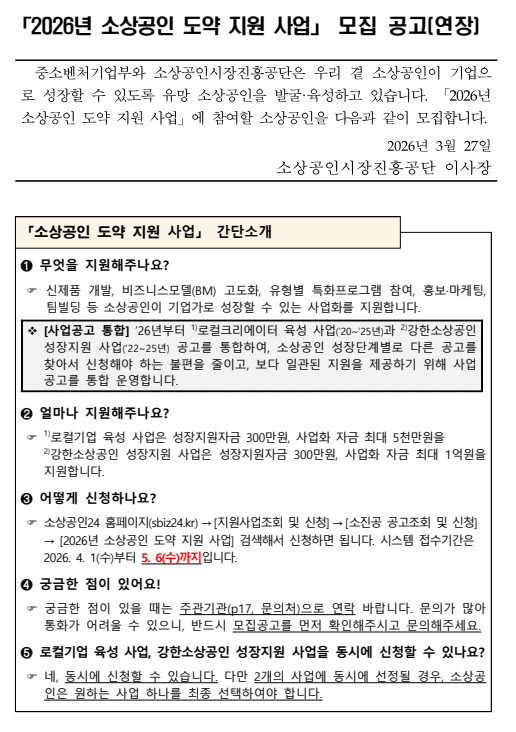 「2026년 소상공인 도약 지원 사업」 모집 공고(연장)
