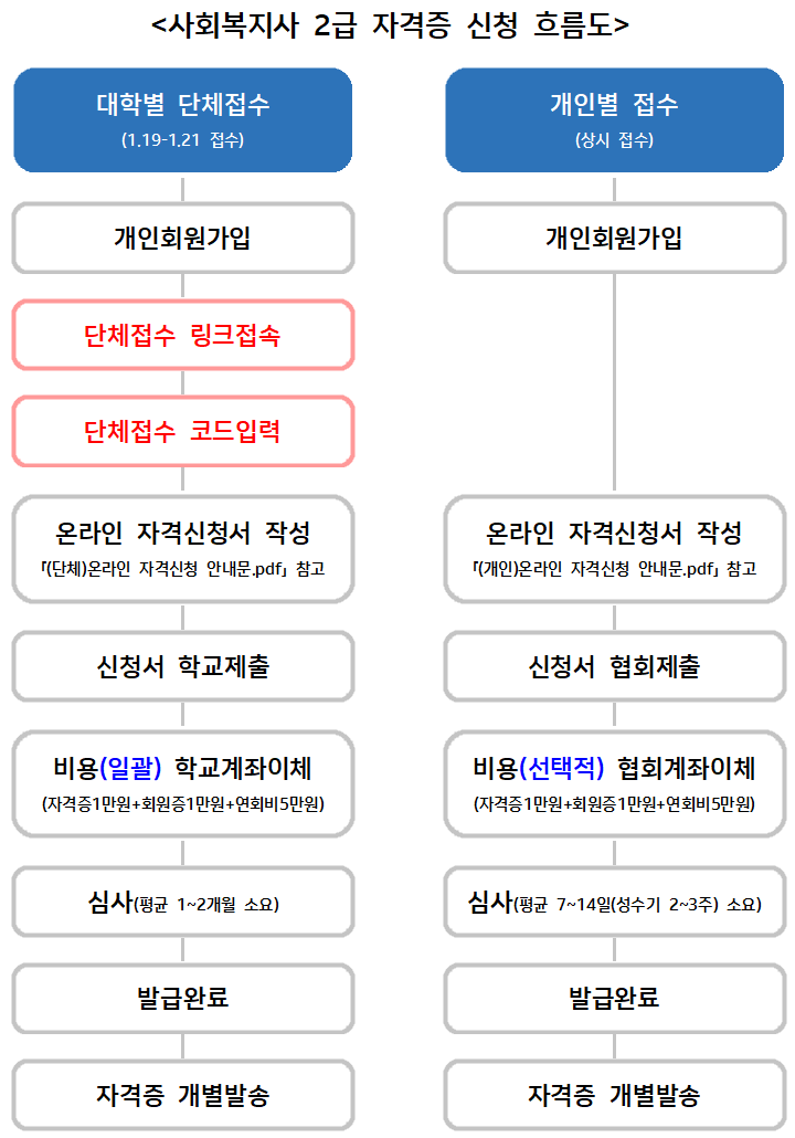: 한국사회복지사협회 자격관리센터(welfare.net) ①개인 회원가입 > 전공별 ②단체접수링크 접속 > ③단체접수코드 입력 > 자격증 발급 ④신청서 온라인작성 > ⑤신청서 출력 > 신청서 및 구비서류 학과사무실로 ⑥등기발송