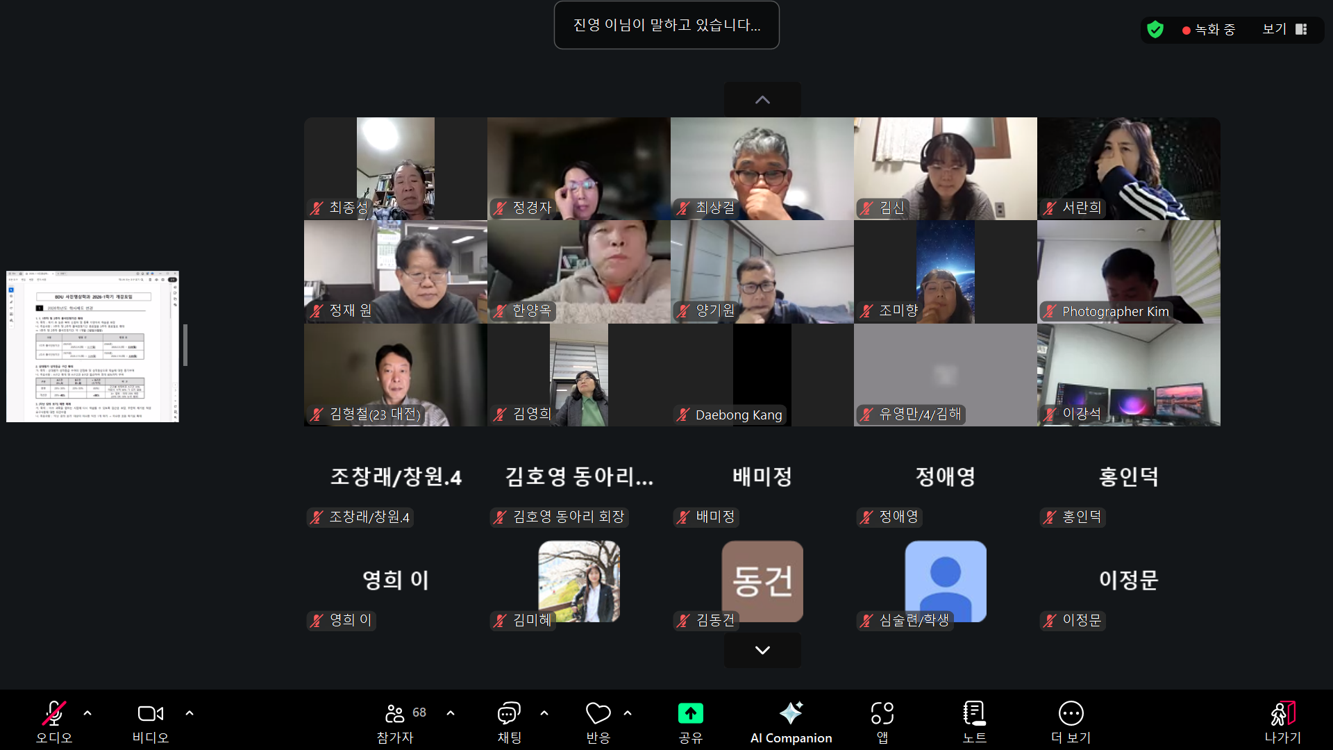 "수업의 퀄리티가 높아 설렌다"는 신입생들의 각오는 현장의 온도를 높였습니다. 선후배가 교류하며 서로의 포부를 공유한 이번 모임은, 더 깊은 사진의 세계를 향한 기대감을 확인하며 깔끔하게 마무리되었습니다. 온라인이라는 캔버스 위에 그려진 이번 만남은 우리 학우들이 기록할 아름다운 인생 사진의 든든한 가이드라인이 될 것입니다.