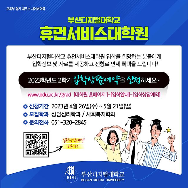 2023학년도 2학기 부산디지털대학교 휴먼서비스대학원에 입학을 희망하는 분들께 입학정보 및 자료를 제공해 드립니다.