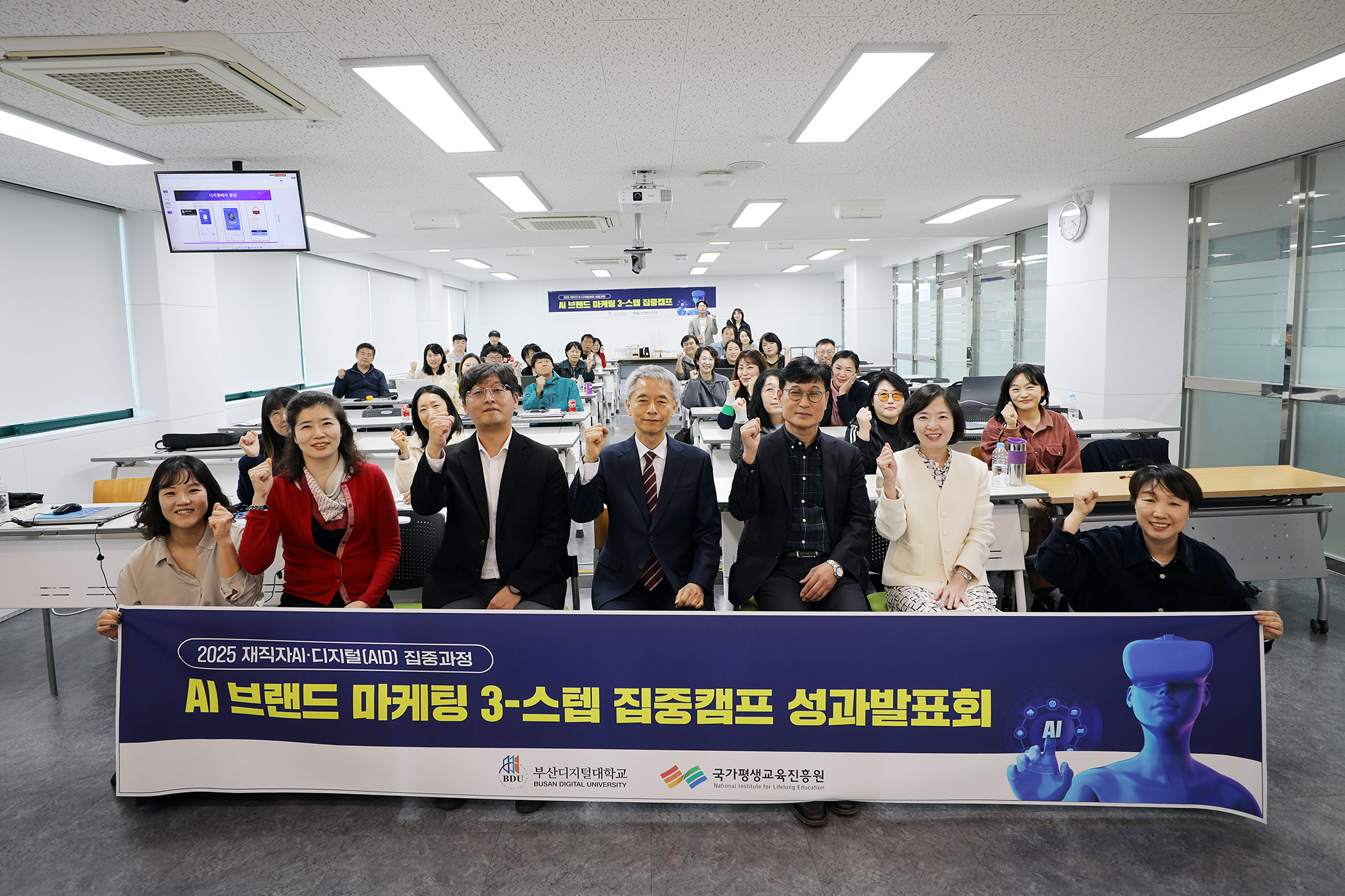 부산디지털대학교 AID사업단은 11월 2일(일), 본교 화상강의실에서 교육부와 국가평생교육진흥원이 주관하는 ‘재직자 AI·디지털(AID) 집중과정 – AID 30+ 집중캠프’를 성공적으로 마치고 1기 수료생을 배출하였다. 이번 캠프는 30세 이상 재직자를 대상으로 주말을 활용해 3주간 진행되었으며, ChatGPT, Midjourney, Framer 등 생성형 AI 도구를 업무에 실질적으로 적용할 수 있도록 구성되어 높은 호응을 얻었다. 디지털 전환이 가속화되는 가운데, 본교 AID사업단은 재직자가 일과 학습을 병행할 수 있도록 실습 중심의 교육과정을 운영하였다. 또한 산학협력 기관과의 MOU 및 특강을 통해 산업 현장의 요구를 반영한 실무형 커리큘럼을 구축하였다.