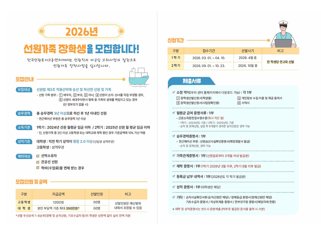 1. 모집대상 : 선원법 적용선박에 승선 및 하선 후 1년 이내인 선원 가족 중 고등학생 혹은 대학생