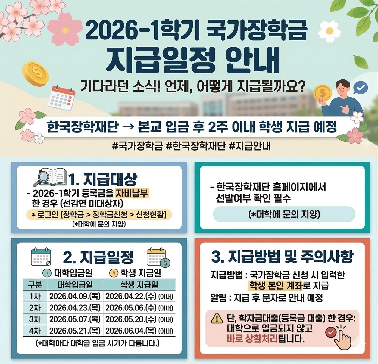 2026-1학기 국가장학금Ⅰ유형의 대략적인 지급일정 및 지급방법에 대해 안내하오니 참고하시기 바랍니다.