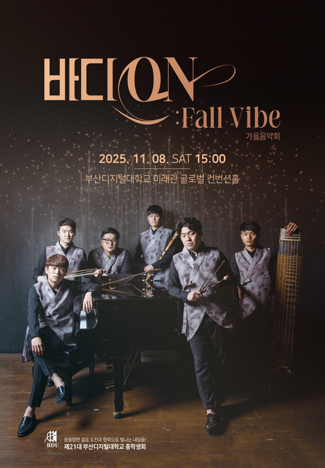 부산디지털대학교 학생들의 중간고사로 지친 마음을 달래기 위한 2025학년도 제21대 총학생회 주최 “가을 음악회 : 얼쑤 신명나는 우리소리~”를 개최하오니 학우님들의 많은 참석 바랍니다.