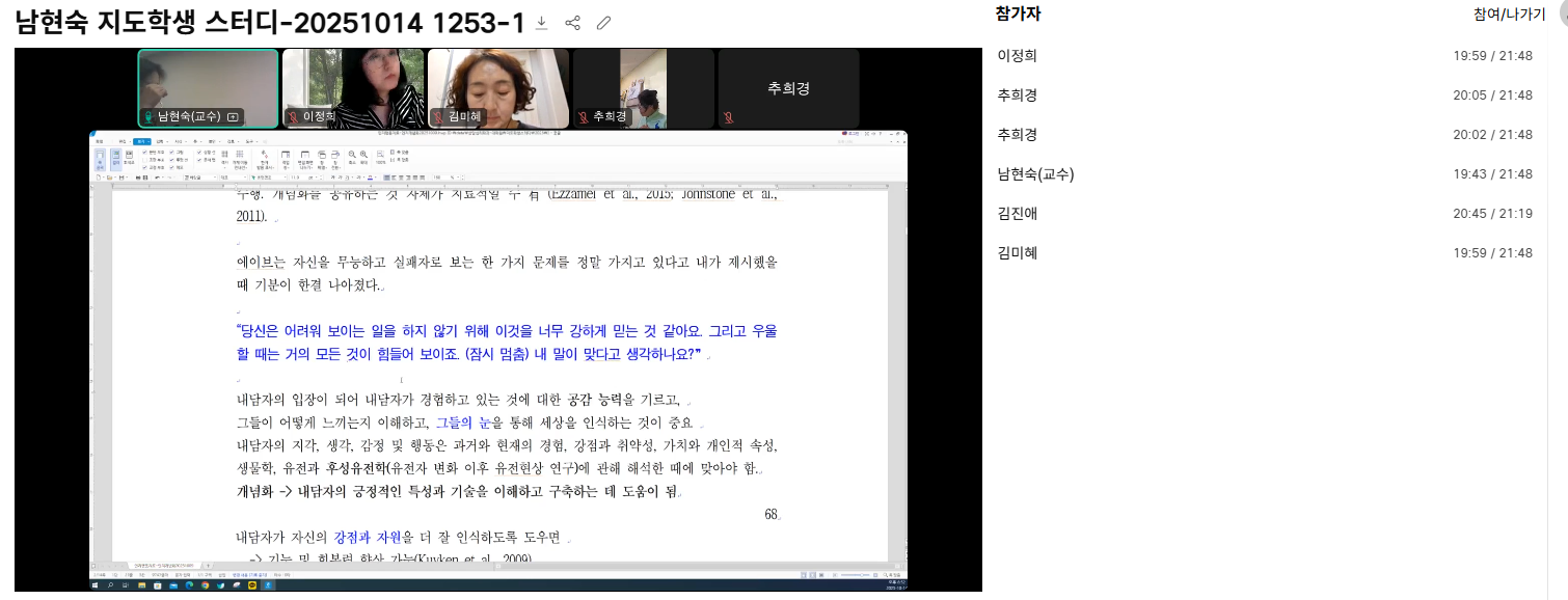 10월 14일(화)에 ‘상담심리학과 남현숙교수 지도학생 스터디’를 실시하였다.