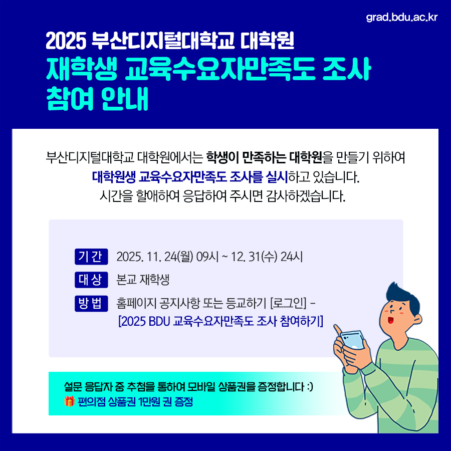대학원에서 대학원 생활 전반에 대한 만족도를 알아보기 위하여 학생 여러분의 만족도 조사를 실시하고자 합니다.